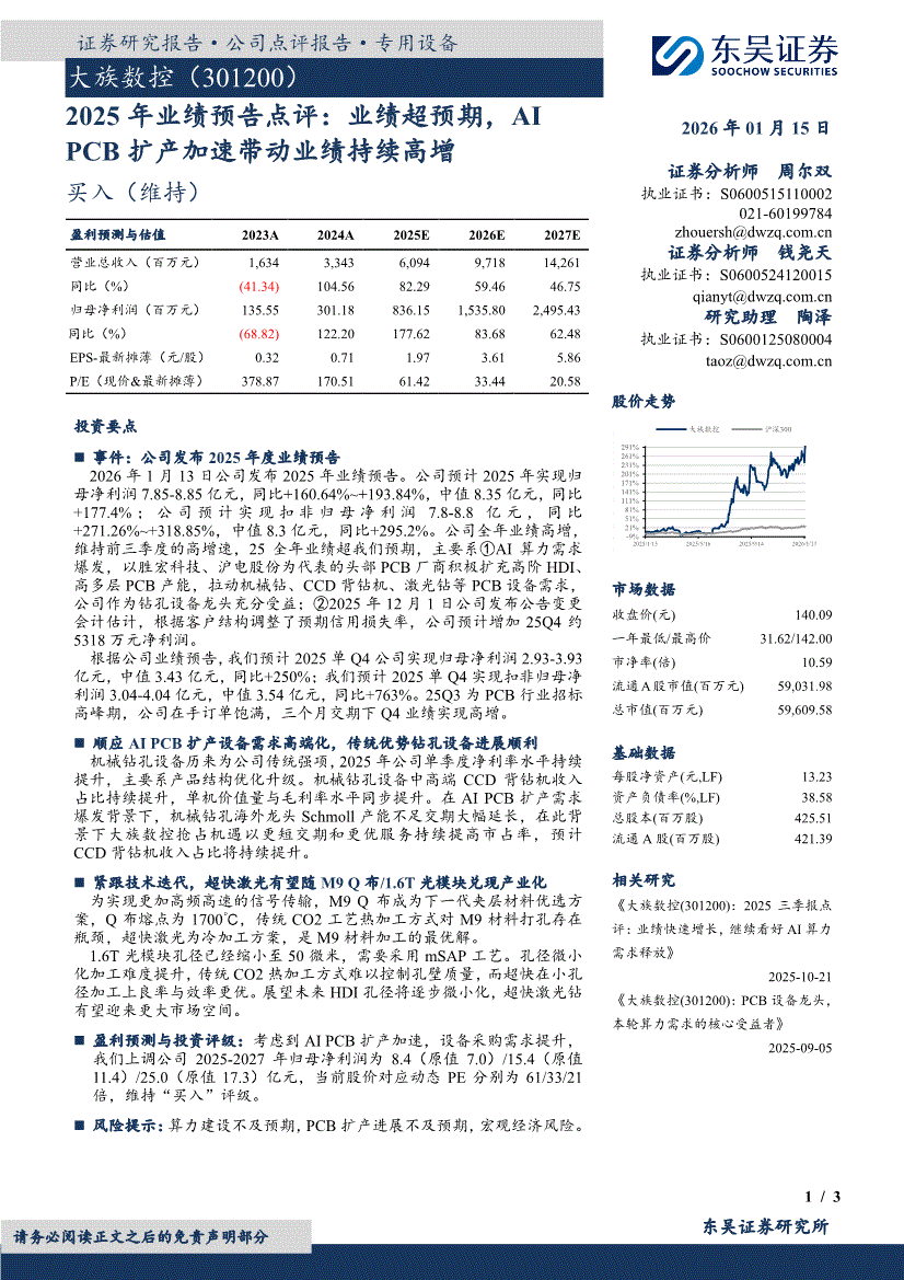 大族数控:东吴证券-大族数控-301200-2025年业绩预告点评:业绩超预期,AI PCB扩产加速带动业绩持续高增-260115