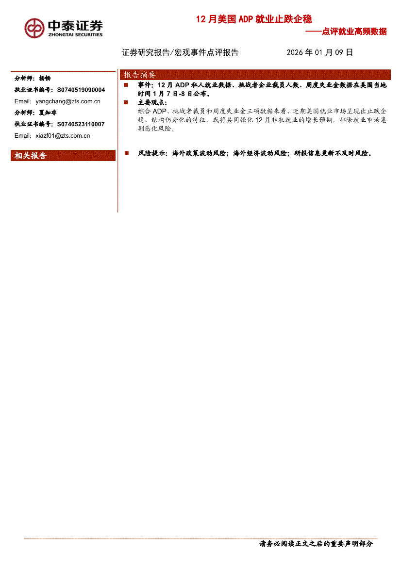 中泰证券-点评就业高频数据:12月美国ADP就业止跌企稳-260109