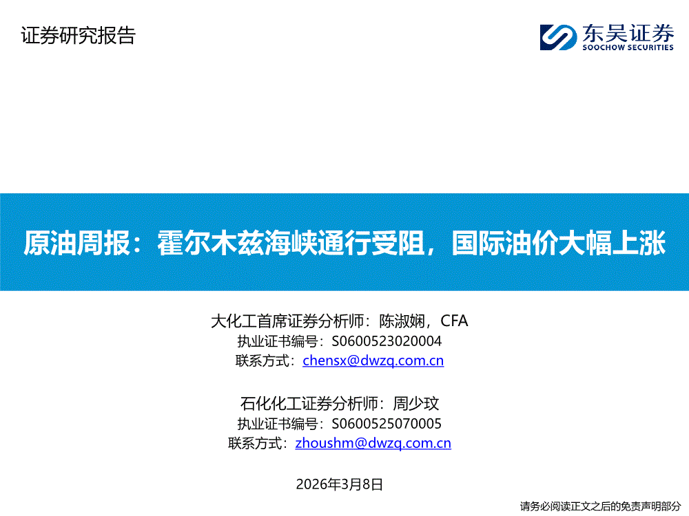 化工行业:东吴证券-化工行业原油周报:霍尔木兹海峡通行受阻,国际油价大幅上涨-260308