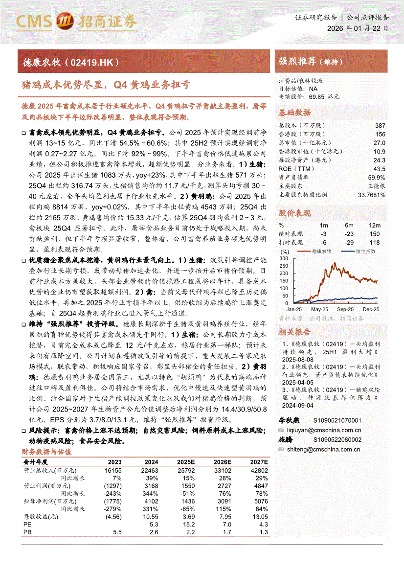 德康农牧:招商证券-德康农牧-2419.HK-猪鸡成本优势尽显,Q4黄鸡业务扭亏-260122