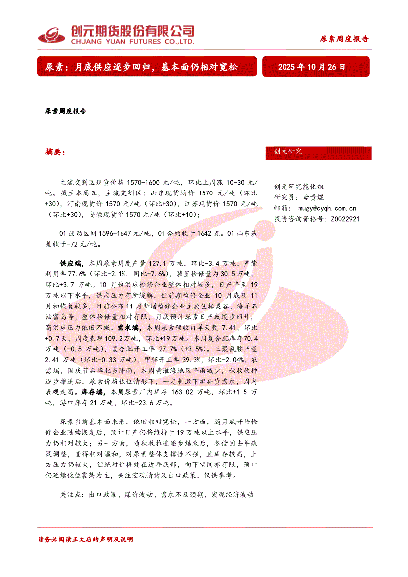 创元期货-尿素周度报告:月底供应逐步回归,基本面仍相对宽松-251026