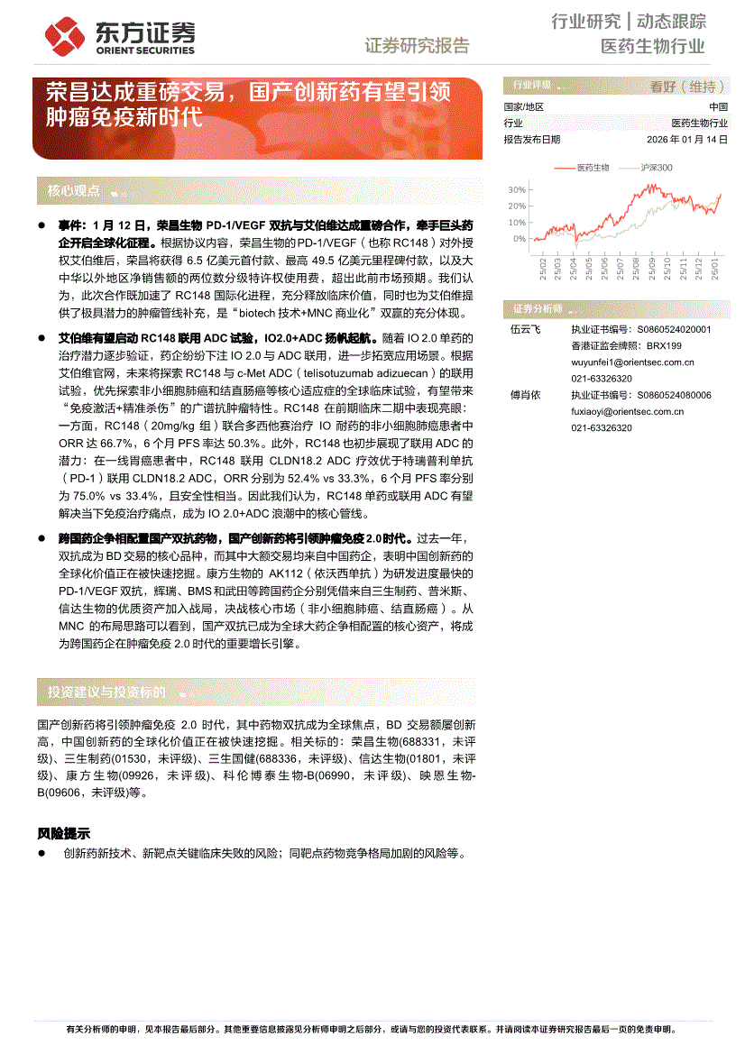 医药生物行业:东方证券-医药生物行业动态跟踪:荣昌达成重磅交易,国产创新药有望引领肿瘤免疫新时代-260114