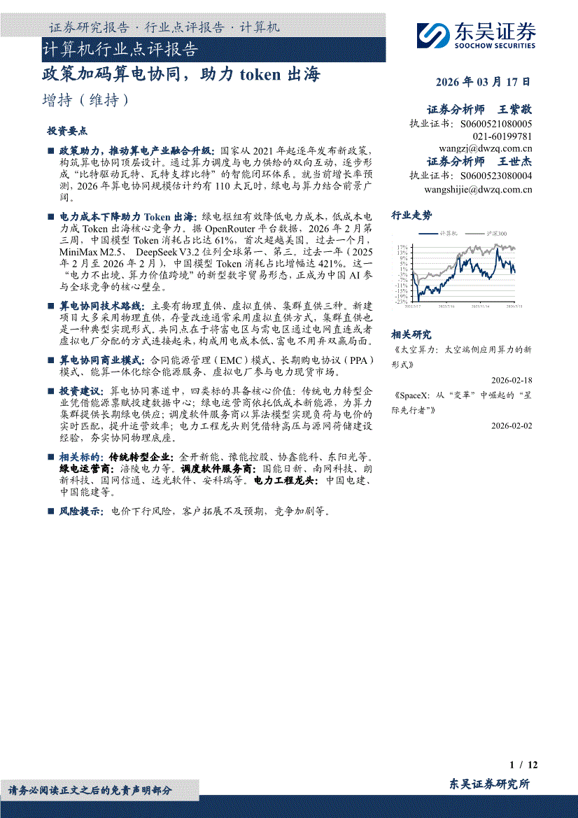 计算机行业:东吴证券-计算机行业点评报告:政策加码算电协同,助力token出海-260317