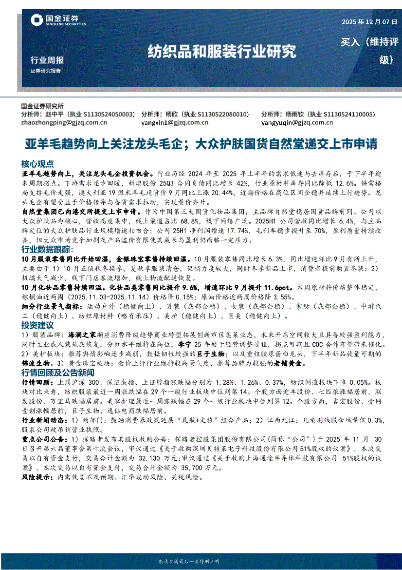 纺织品和服装行业:国金证券-纺织品和服装行业研究:亚羊毛趋势向上关注龙头毛企;大众护肤国货自然堂递交上市申请-251207
