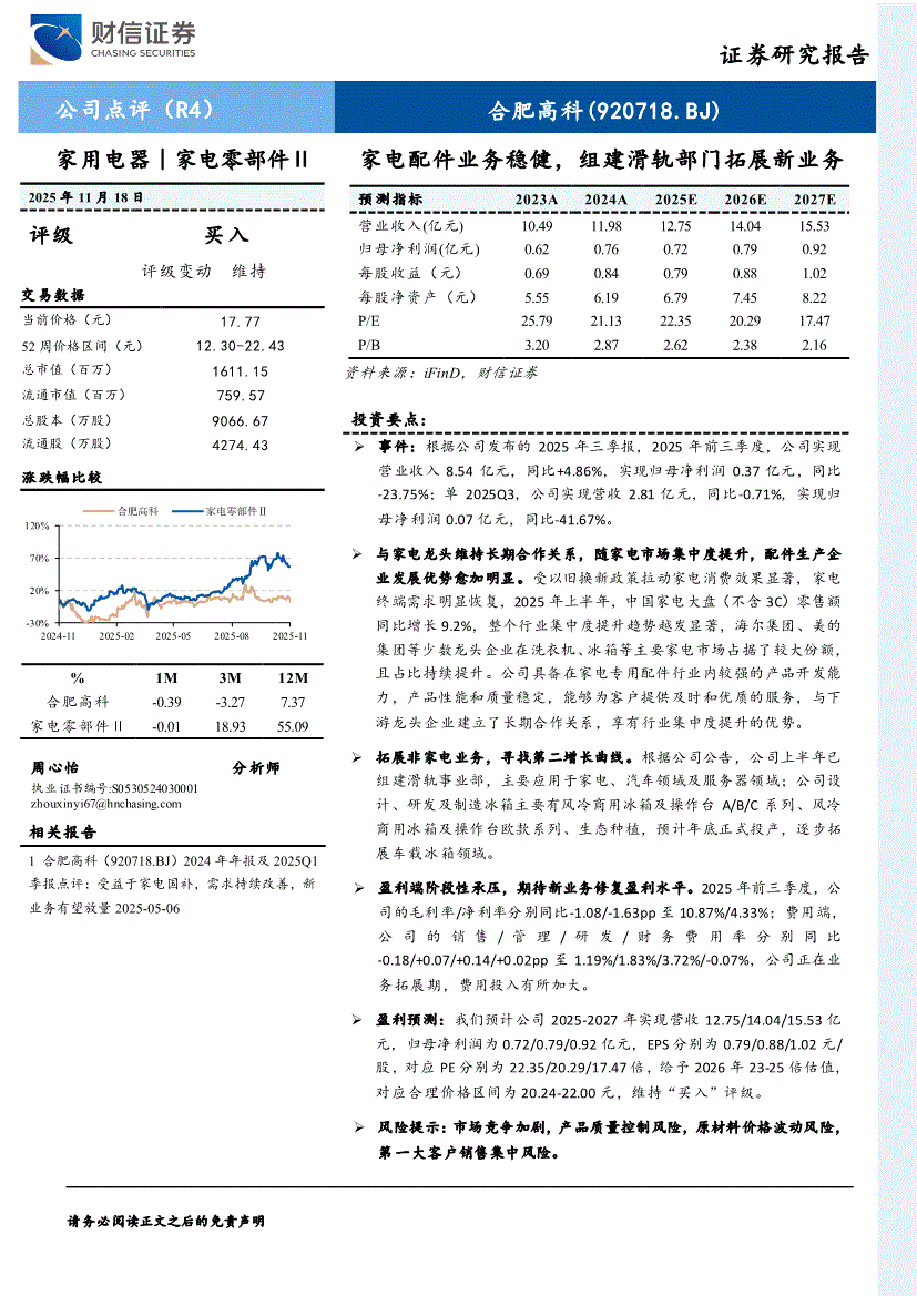 合肥高科:财信证券-合肥高科-920718-家电配件业务稳健,组建滑轨部门拓展新业务-251118