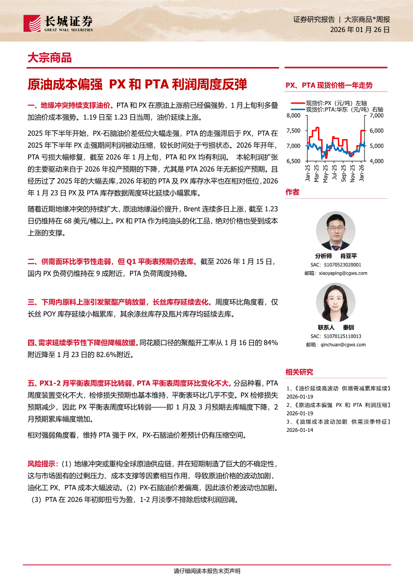 长城证券-大宗商品周报:原油成本偏强,PX和PTA利润周度反弹-260126