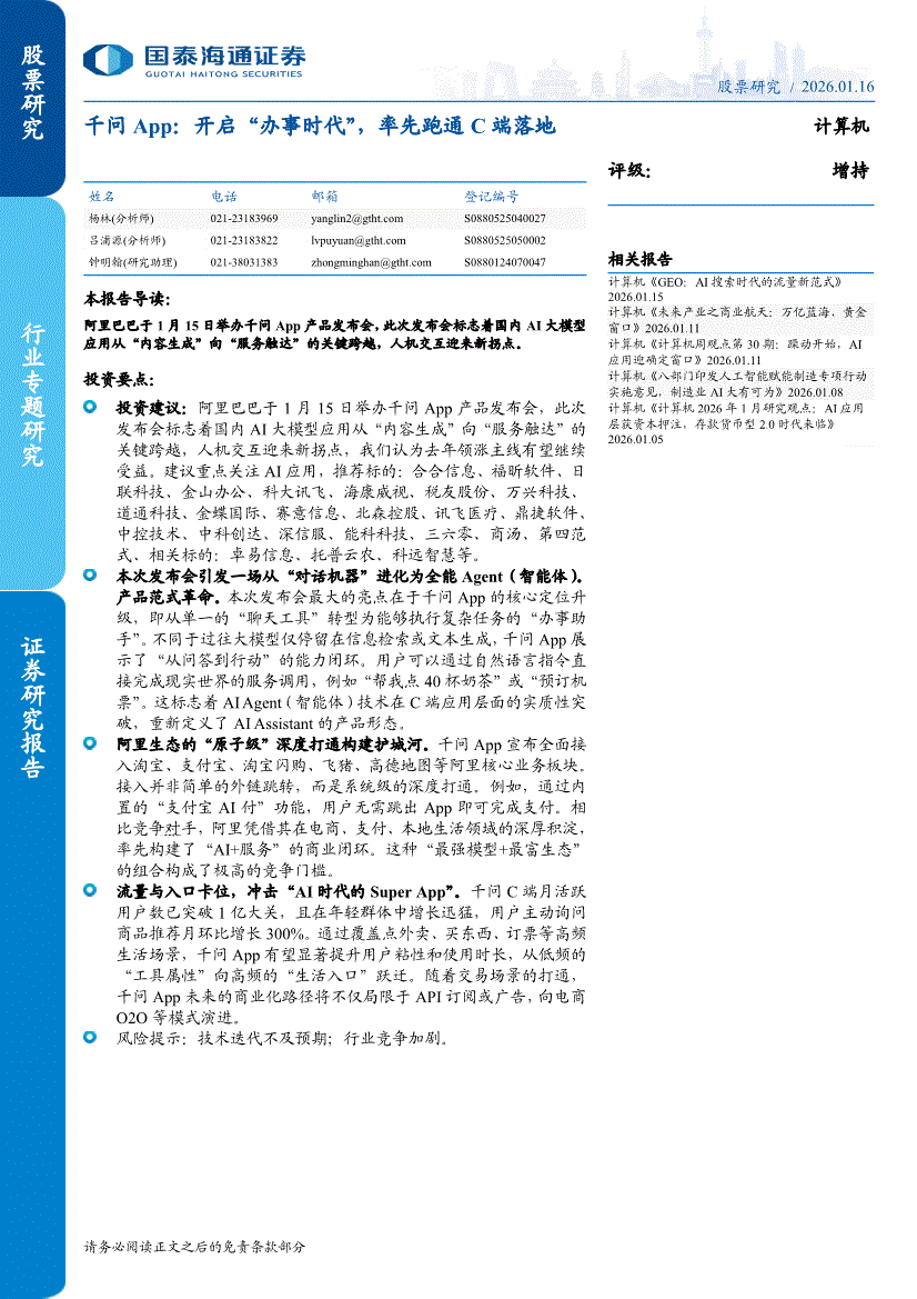 计算机行业:国泰海通证券-计算机行业千问App:开启“办事时代”,率先跑通C端落地-260116