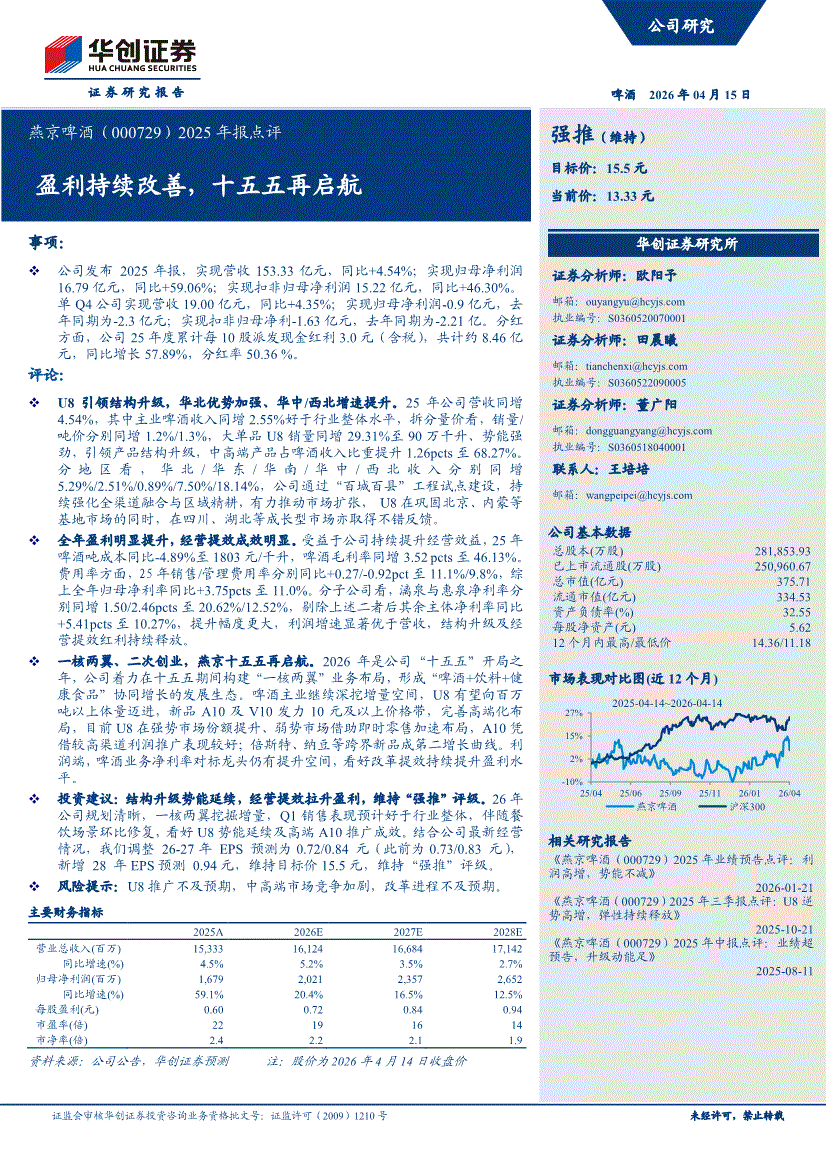 燕京啤酒:华创证券-燕京啤酒-000729-2025年报点评:盈利持续改善,十五五再启航-260415