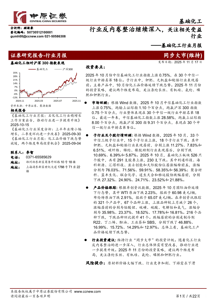 基础化工行业:中原证券-基础化工行业月报:行业反内卷整治继续深入,关注相关受益行业-251117