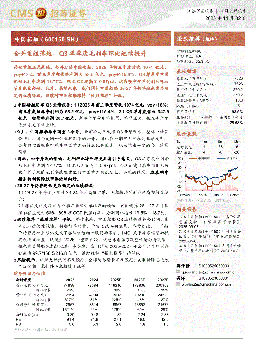 中国船舶:招商证券-中国船舶-600150-合并重组落地,Q3单季度毛利率环比继续提升-251102