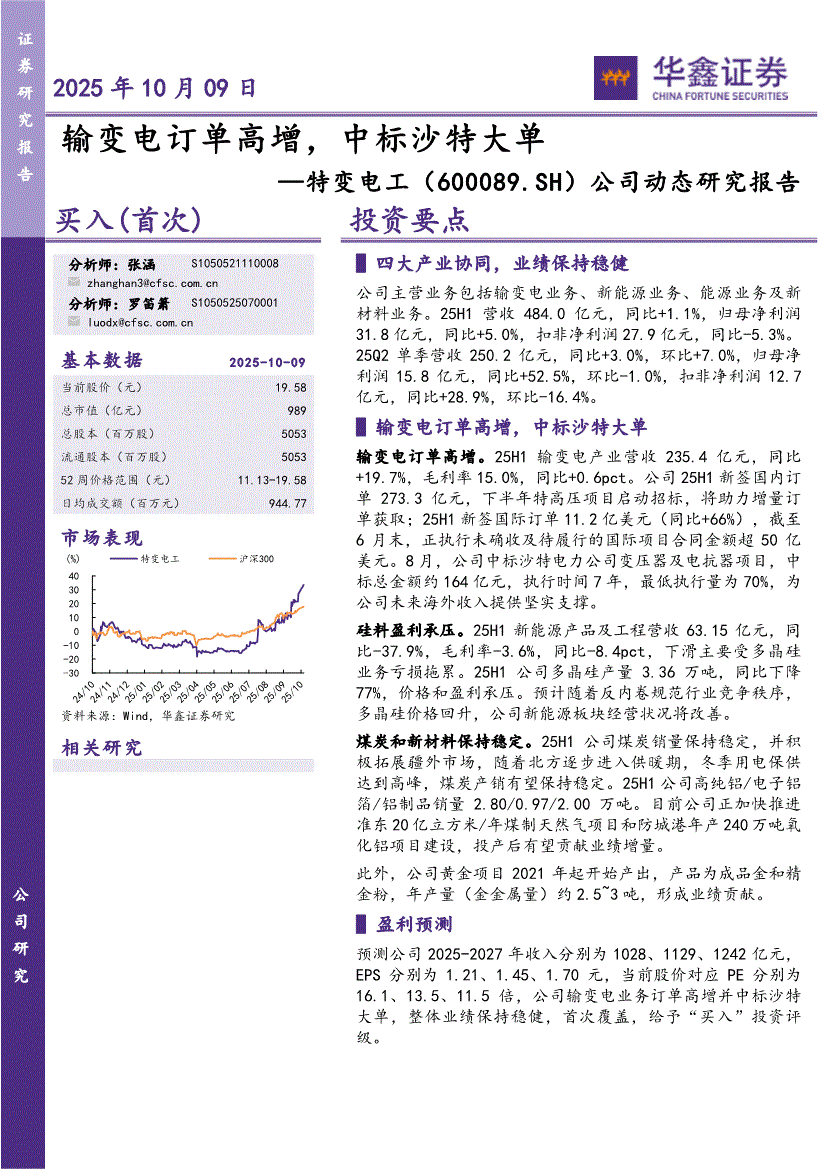 特变电工:华鑫证券-特变电工-600089-公司动态研究报告:输变电订单高增,中标沙特大单-251009