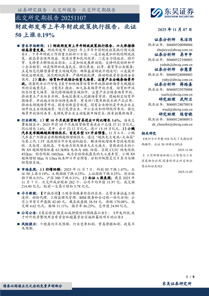 东吴证券-北交所定期报告:财政部发布上半年财政政策执行报告,北证50上涨0.19%-251107