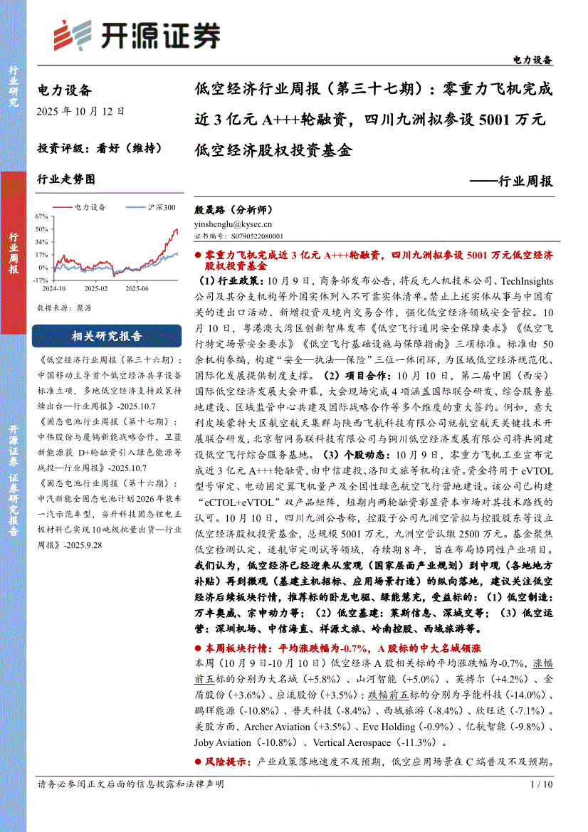 低空经济行业:开源证券-低空经济行业周报(第三十七期):零重力飞机完成近3亿元A+++轮融资,四川九洲拟参设5001万元低空经济股权投资基金-251012