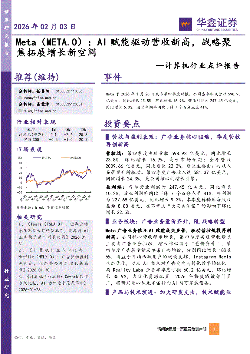 计算机行业:华鑫证券-计算机行业点评报告:Meta(META.O),AI赋能驱动营收新高,战略聚焦拓展增长新空间-260203