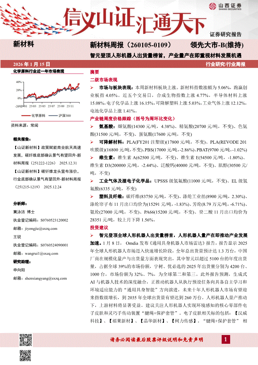 新材料行业:山西证券-新材料行业周报:智元登顶人形机器人出货量榜首,产业量产在即重视材料发展机遇-260205