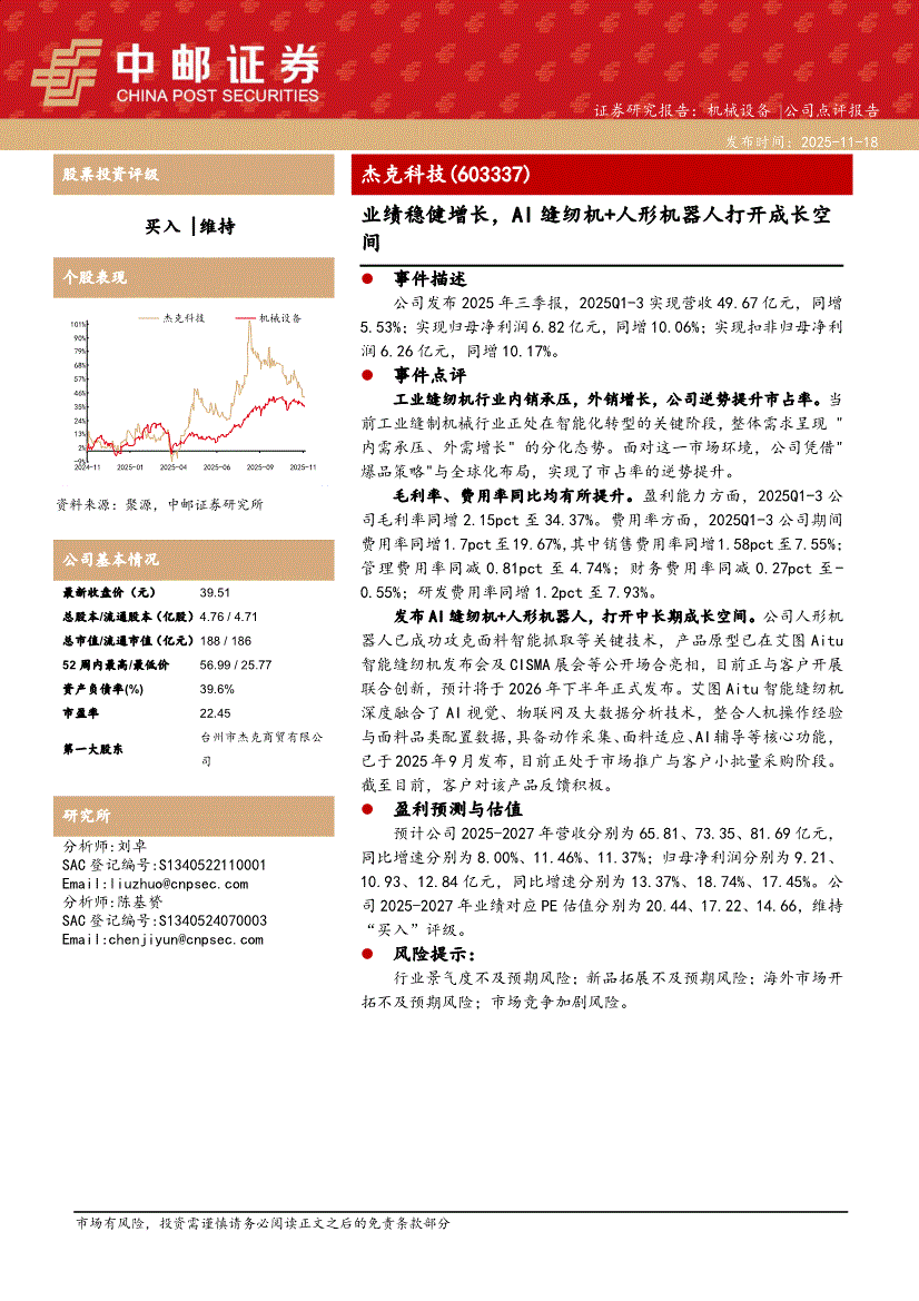 杰克科技:中邮证券-杰克科技-603337-业绩稳健增长,AI缝纫机+人形机器人打开成长空间-251118