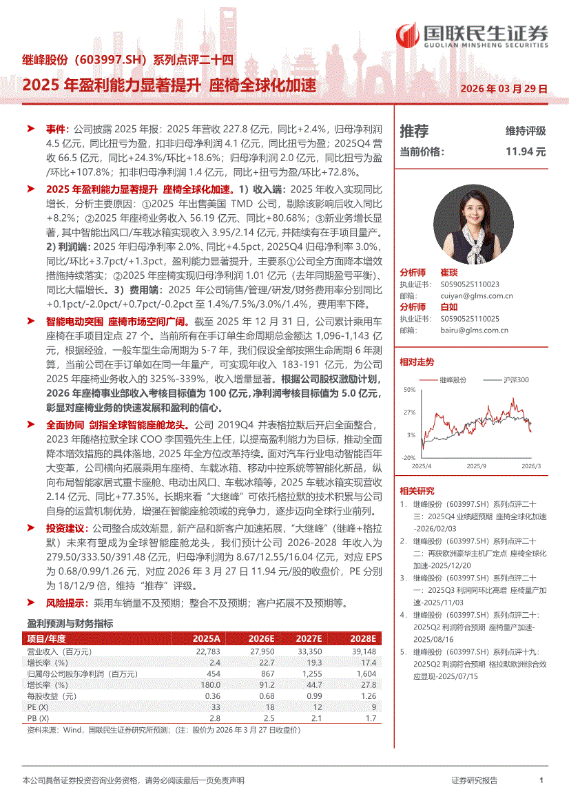 继峰股份:国联民生证券-继峰股份-603997-系列点评二十四:2025年盈利能力显著提升,座椅全球化加速-260329