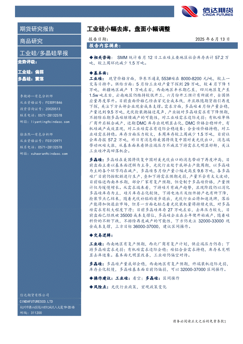 信达期货-工业硅/多晶硅早报:工业硅小幅去库,盘面小幅调整-250613