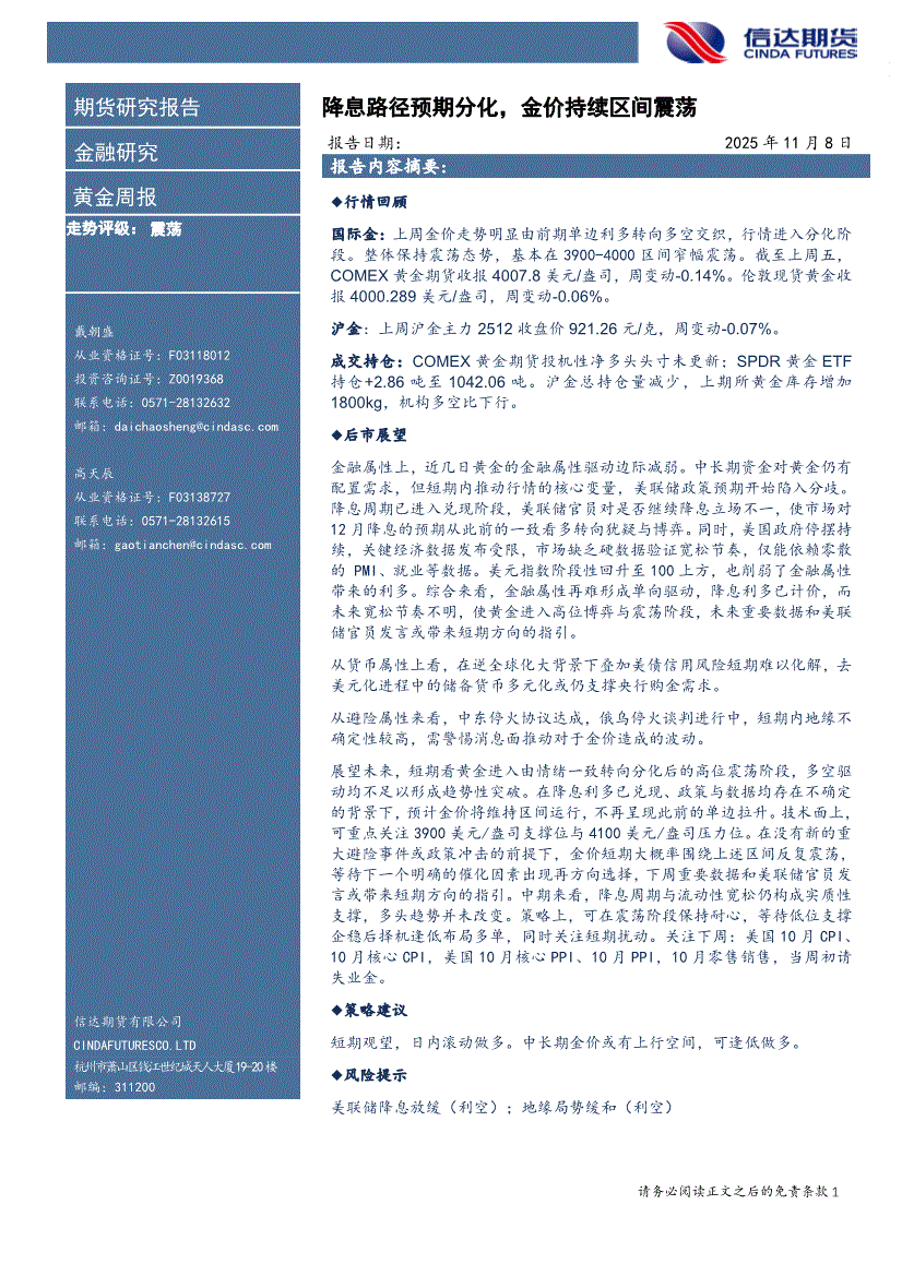 信达期货-黄金周报:降息路径预期分化,金价持续区间震荡-251108