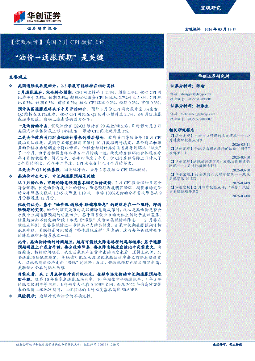 华创证券-【宏观快评】美国2月CPI数据点评:“油价→通胀预期”是关键-260313