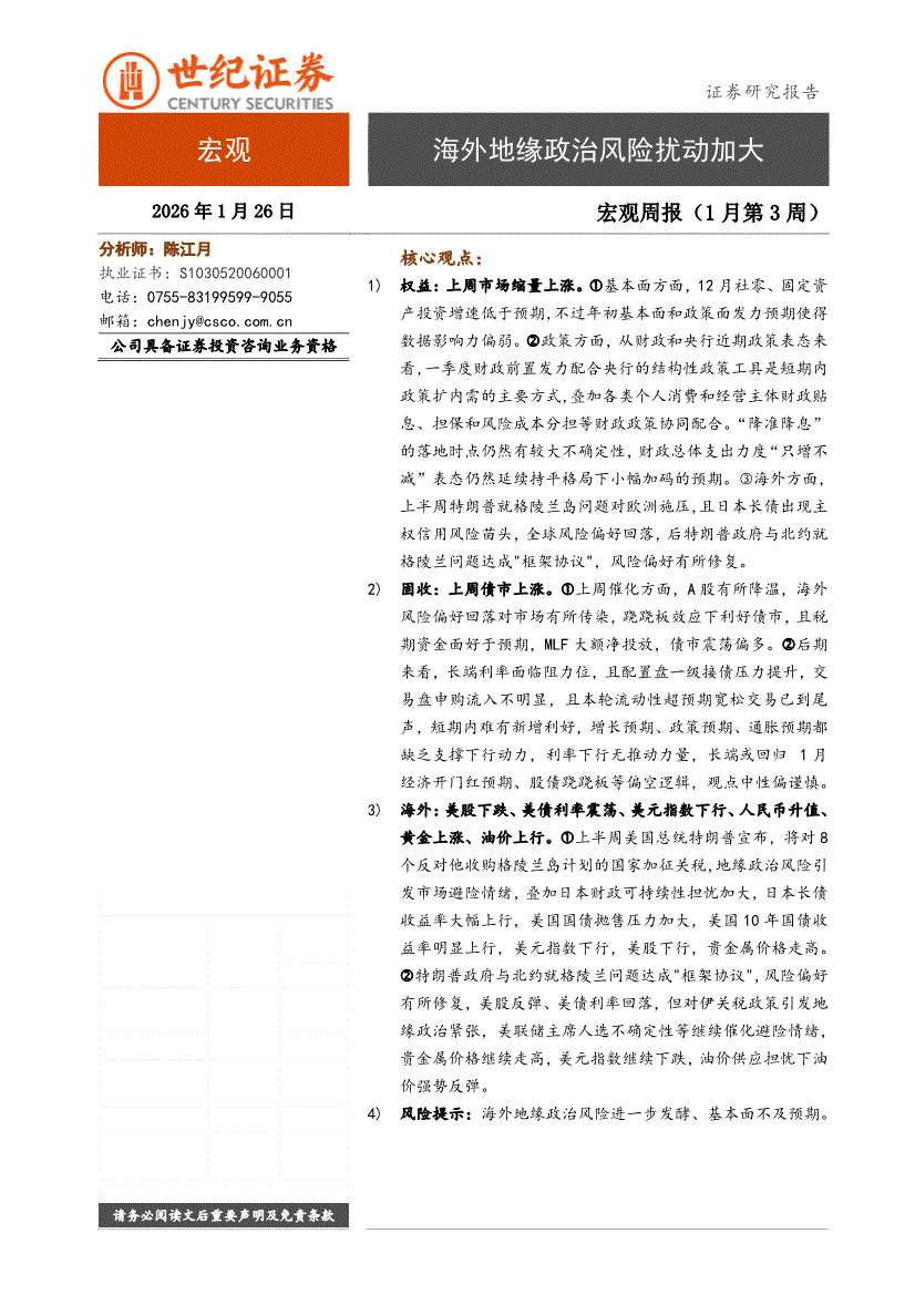 世纪证券-宏观周报(1月第3周):海外地缘政治风险扰动加大-260126