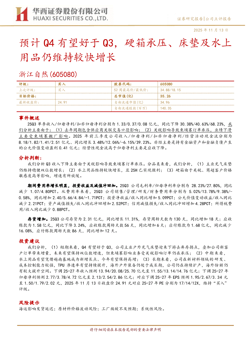 浙江自然:华西证券-浙江自然-605080-预计Q4有望好于Q3,硬箱承压、床垫及水上用品仍维持较快增长-251113