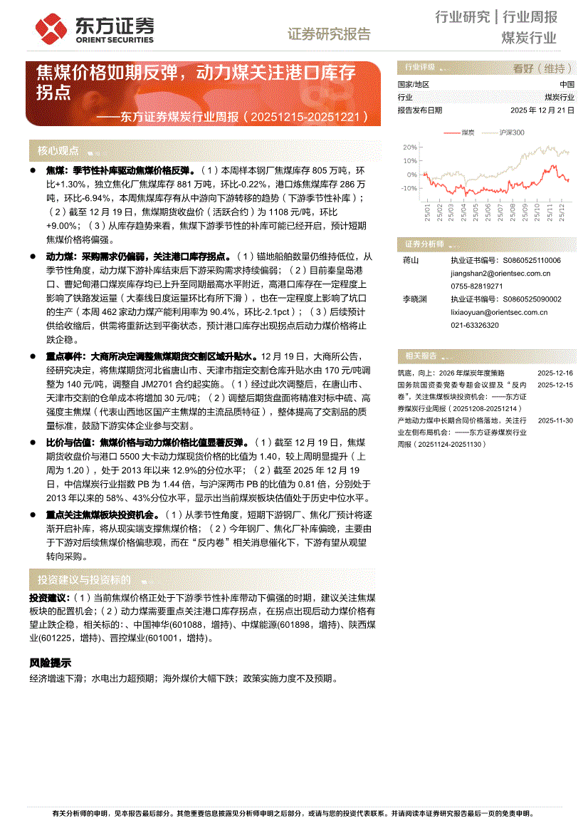 煤炭行业:东方证券-煤炭行业周报:焦煤价格如期反弹,动力煤关注港口库存拐点-251221
