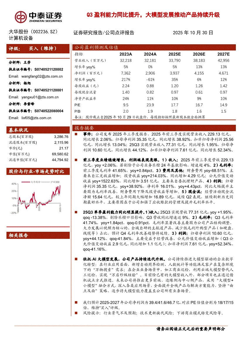 大华股份:中泰证券-大华股份-002236-Q3盈利能力同比提升,大模型发展推动产品持续升级-251030