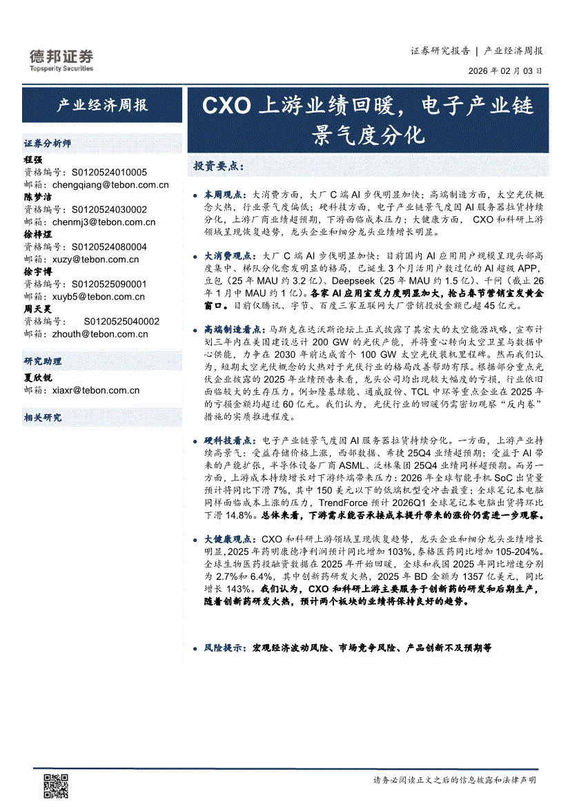 德邦证券-产业经济周报:CXO上游业绩回暖,电子产业链景气度分化-260203
