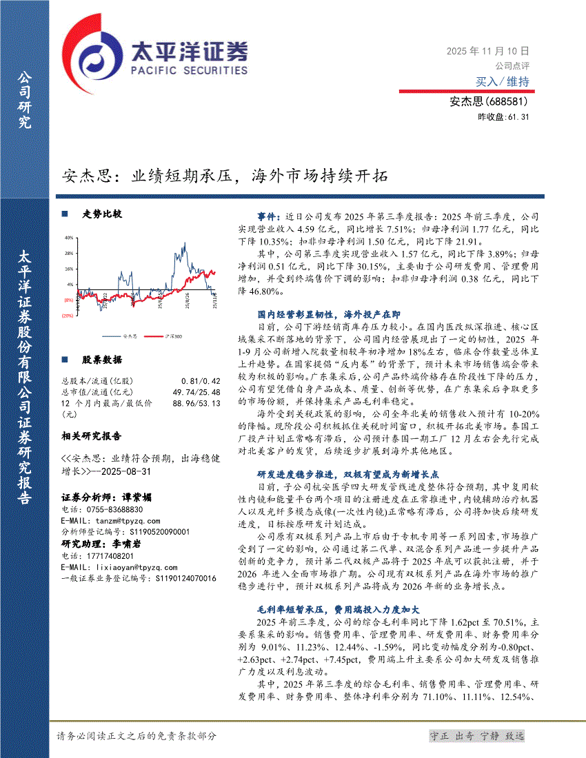 安杰思:太平洋证券-安杰思-688581-业绩短期承压,海外市场持续开拓-251110