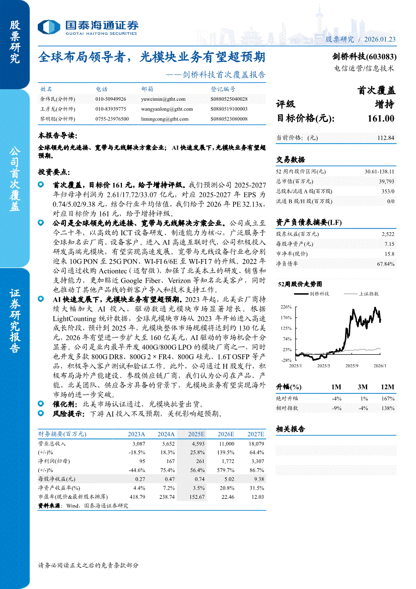 剑桥科技:国泰海通证券-剑桥科技-603083-首次覆盖报告:全球布局领导者,光模块业务有望超预期-260123