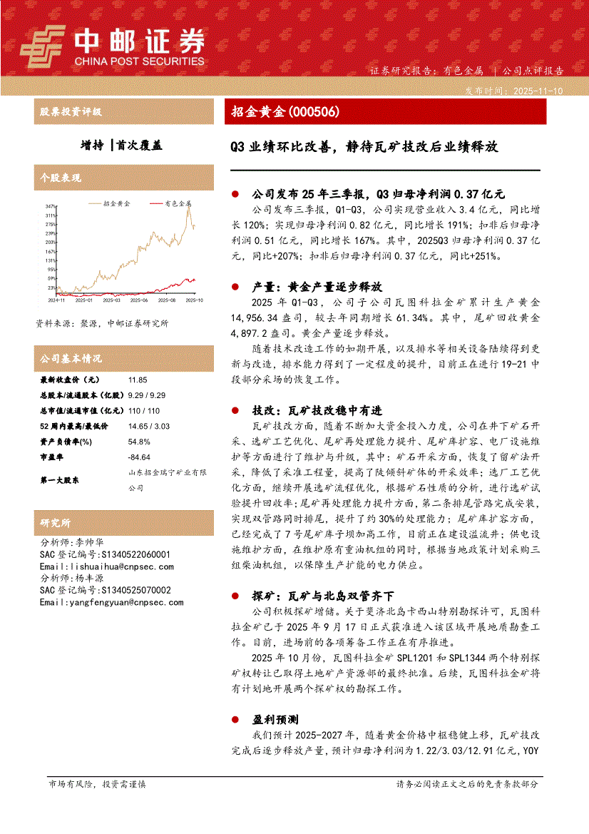 招金黄金:中邮证券-招金黄金-000506-Q3业绩环比改善,静待瓦矿技改后业绩释放-251110