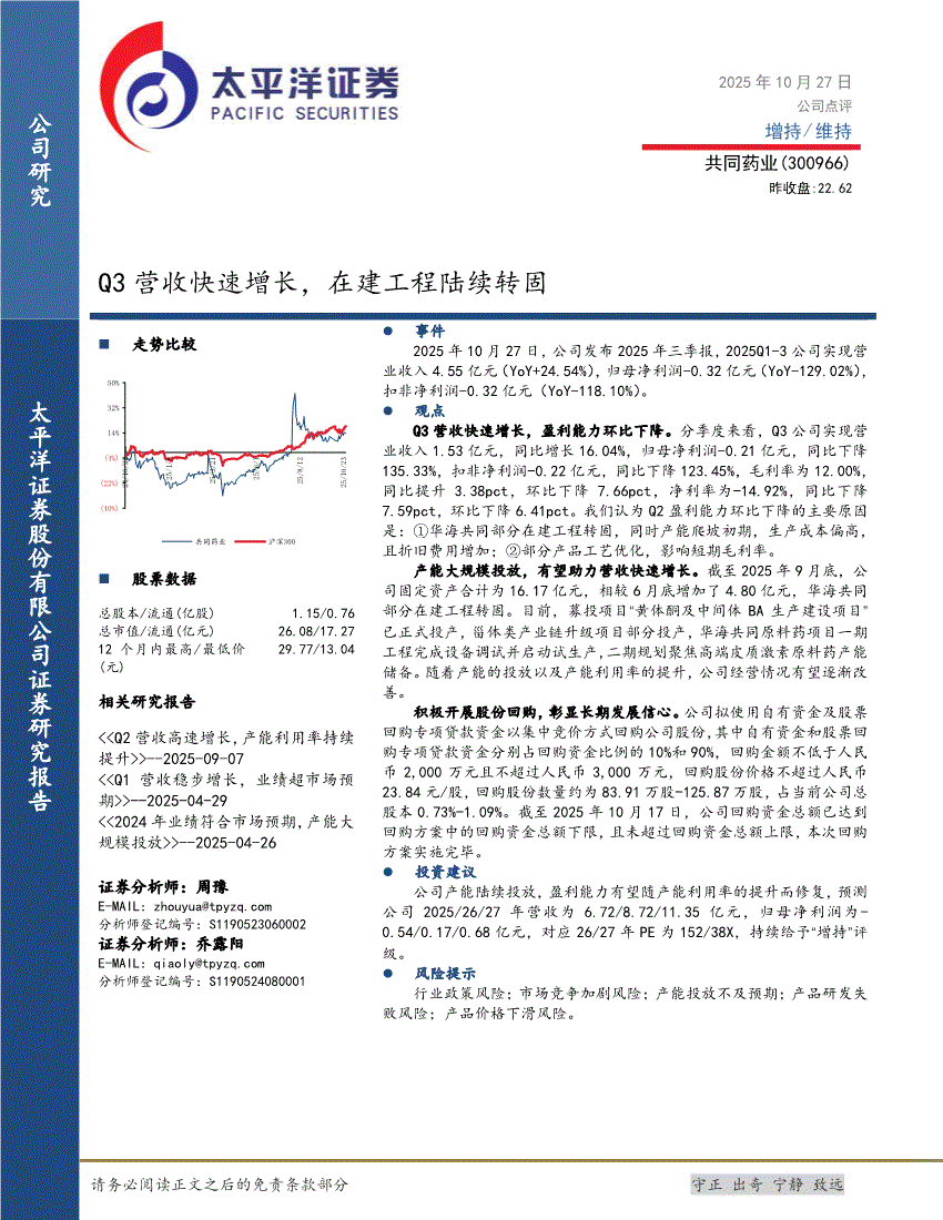 共同药业:太平洋证券-共同药业-300966-Q3营收快速增长,在建工程陆续转固-251027