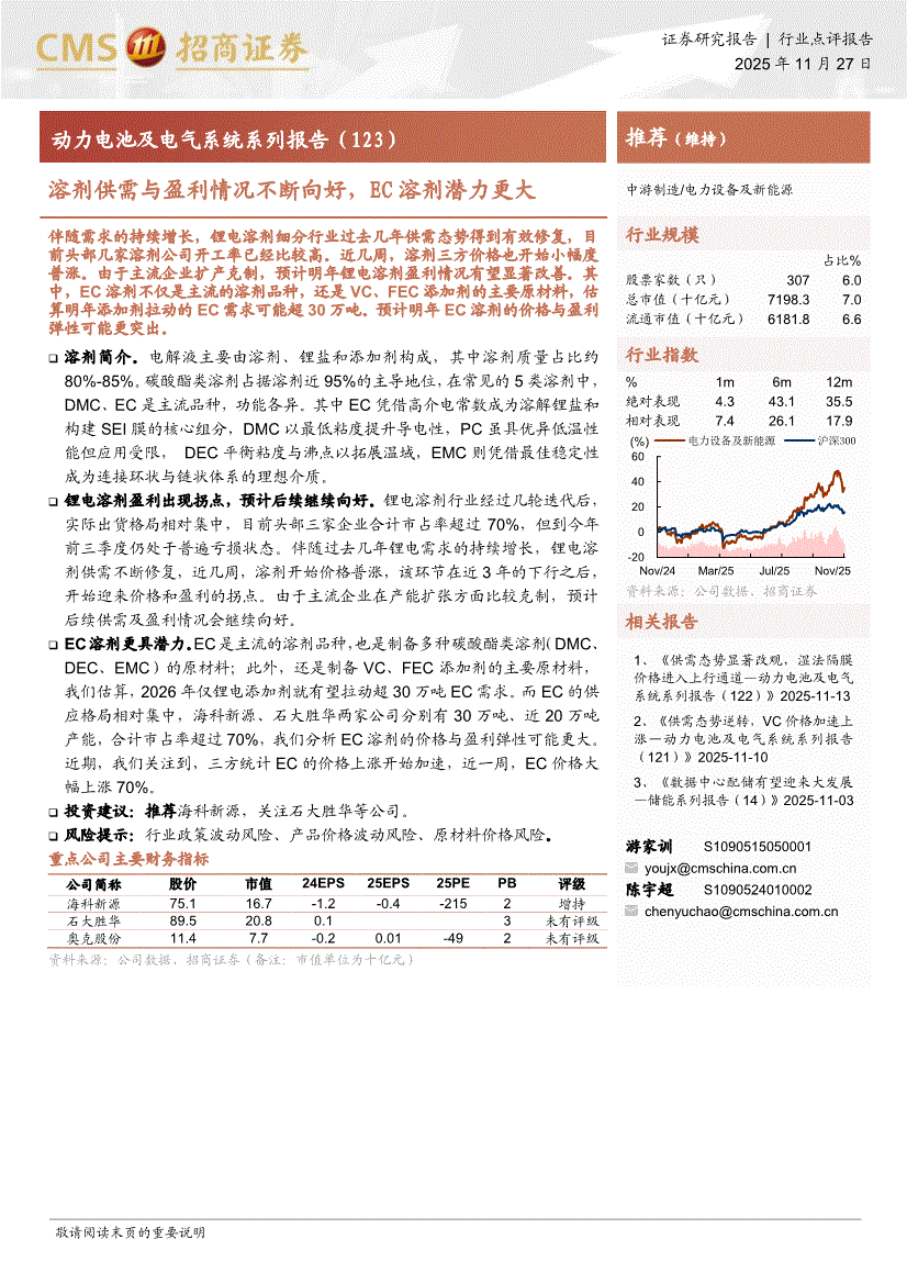电力设备及新能源行业:招商证券-电力设备及新能源行业动力电池及电气系统系列报告(123):溶剂供需与盈利情况不断向好,EC溶剂潜力更大-251127