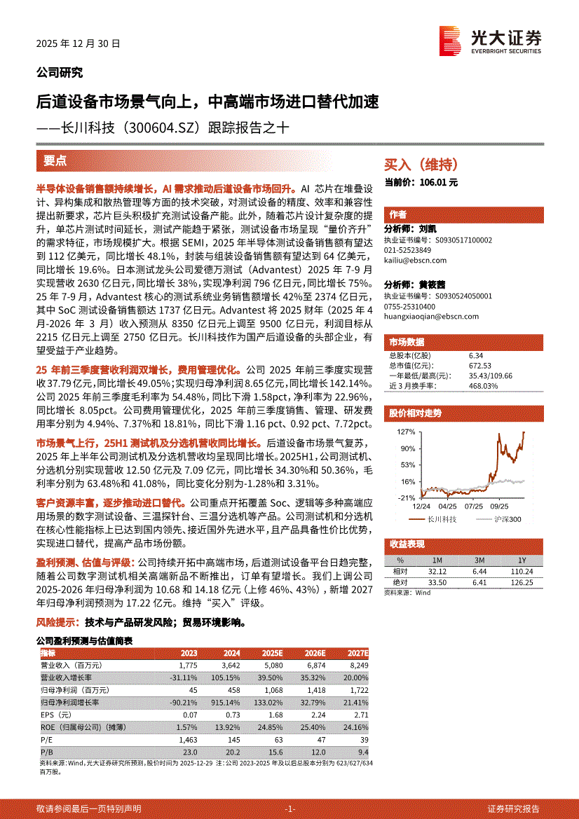 长川科技:光大证券-长川科技-300604-跟踪报告之十:后道设备市场景气向上,中高端市场进口替代加速-251230