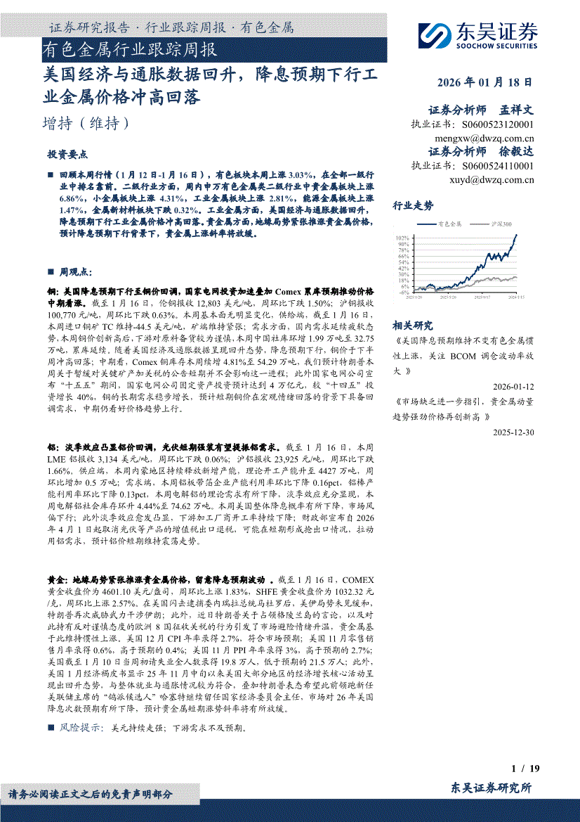 有色金属行业:东吴证券-有色金属行业跟踪周报:美国经济与通胀数据回升,降息预期下行工业金属价格冲高回落-260118