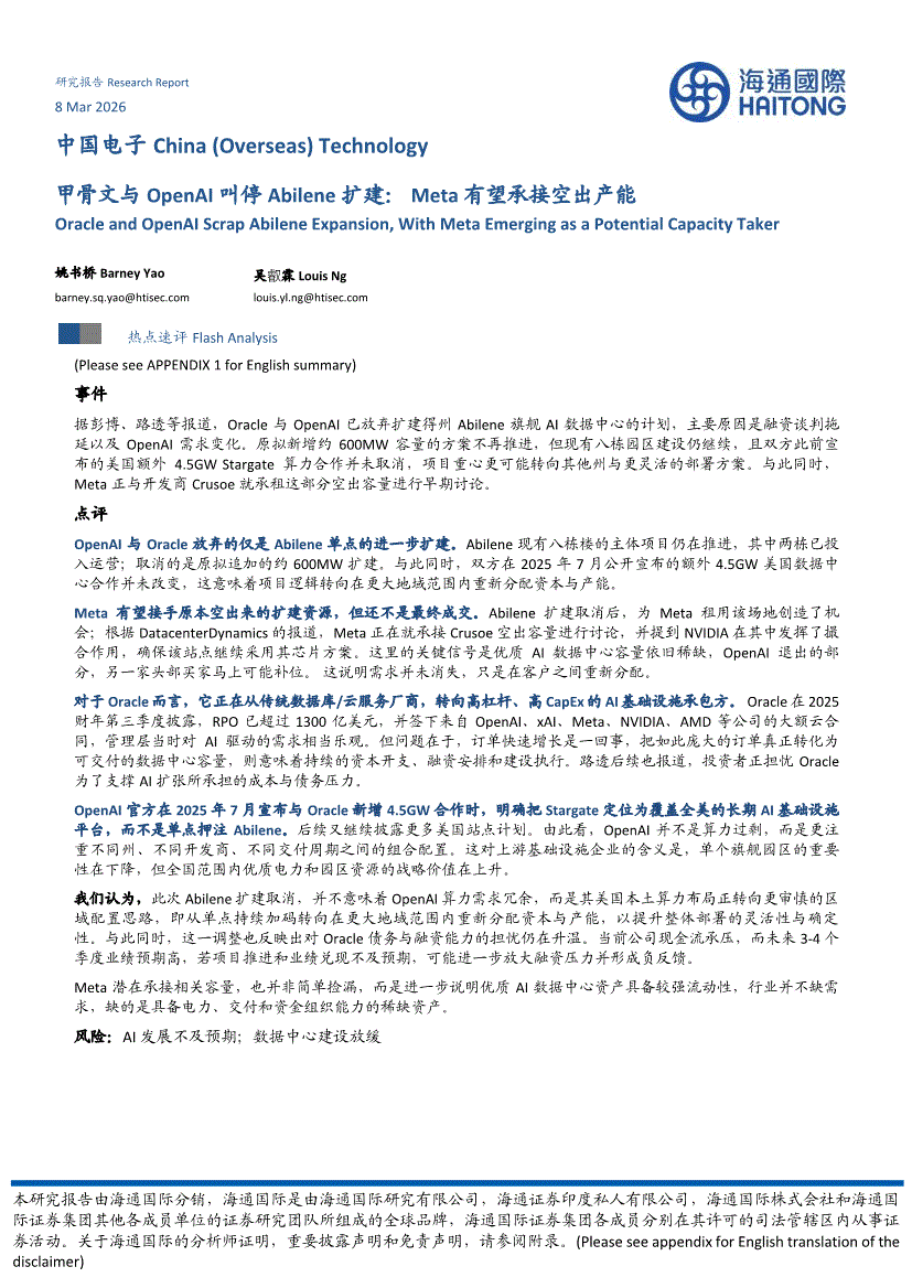 电子行业:海通国际-中国电子行业:甲骨文与OpenAI叫停Abilene扩建,Meta有望承接空出产能-260308