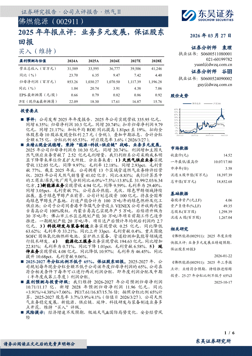 佛燃能源:东吴证券-佛燃能源-002911-2025年年报点评:业务多元发展,保证股东回报-260327