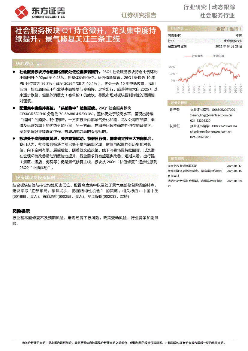 社会服务行业:东方证券-社会服务行业:社会服务板块Q1持仓微升,龙头集中度持续提升,景气修复关注三条主线-260428
