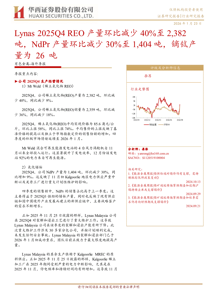 有色金属行业:华西证券-有色金属行业海外季报:Lynas 2025Q4 REO产量环比减少40%至2,382吨,NdPr产量环比减少30%至1,404吨,镝铽产量为26吨-260123