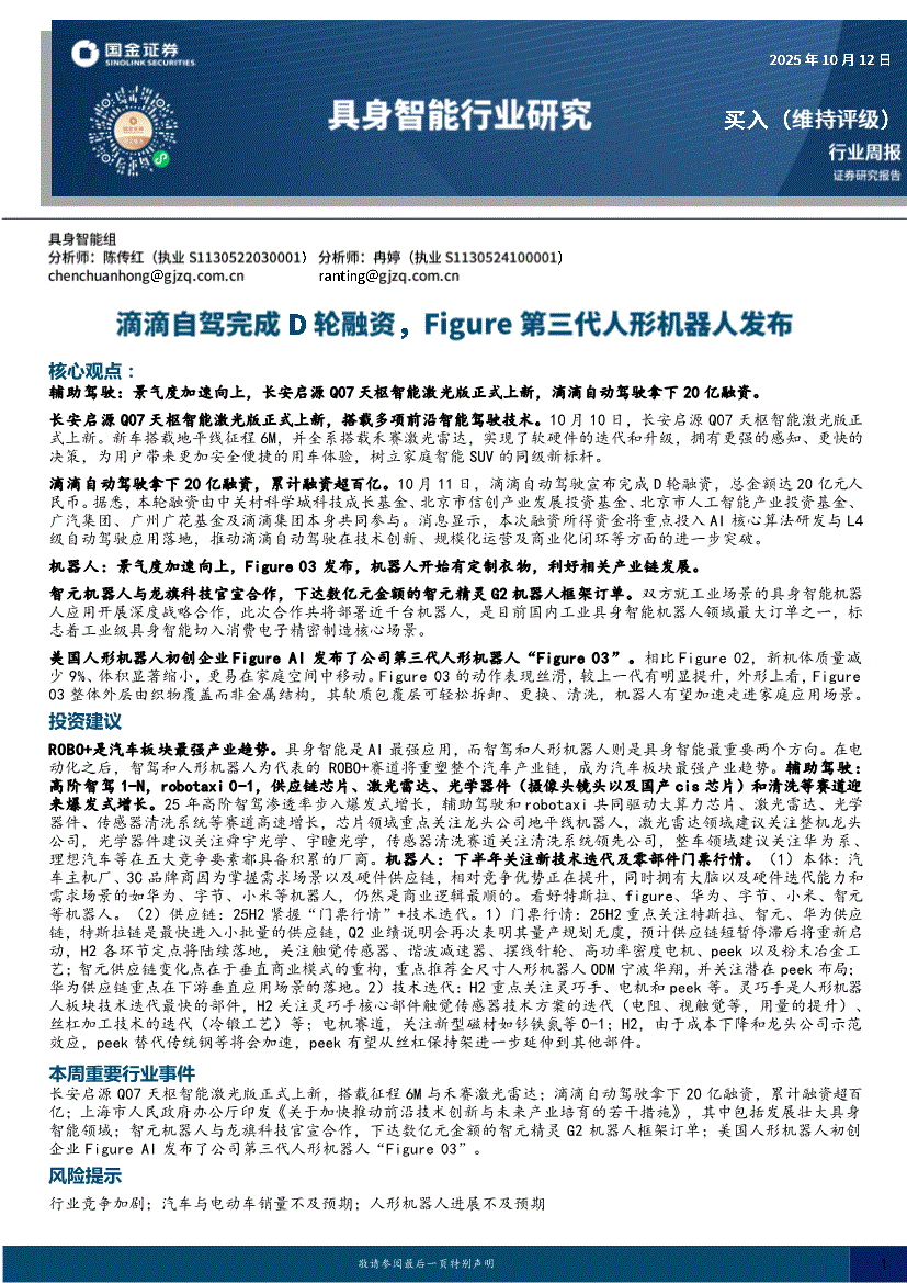 具身智能行业:国金证券-具身智能行业周报:滴滴自驾完成D轮融资,Figure第三代人形机器人发布-251012