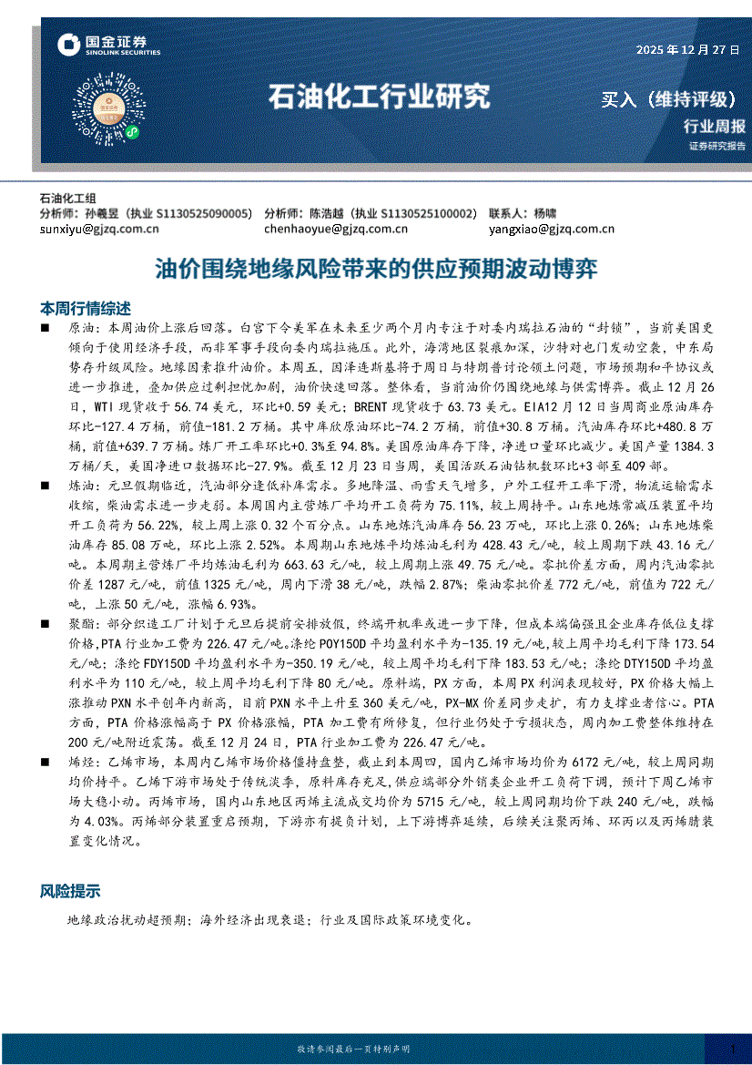 石油化工行业:国金证券-石油化工行业周报:油价围绕地缘风险带来的供应预期波动博弈-251227