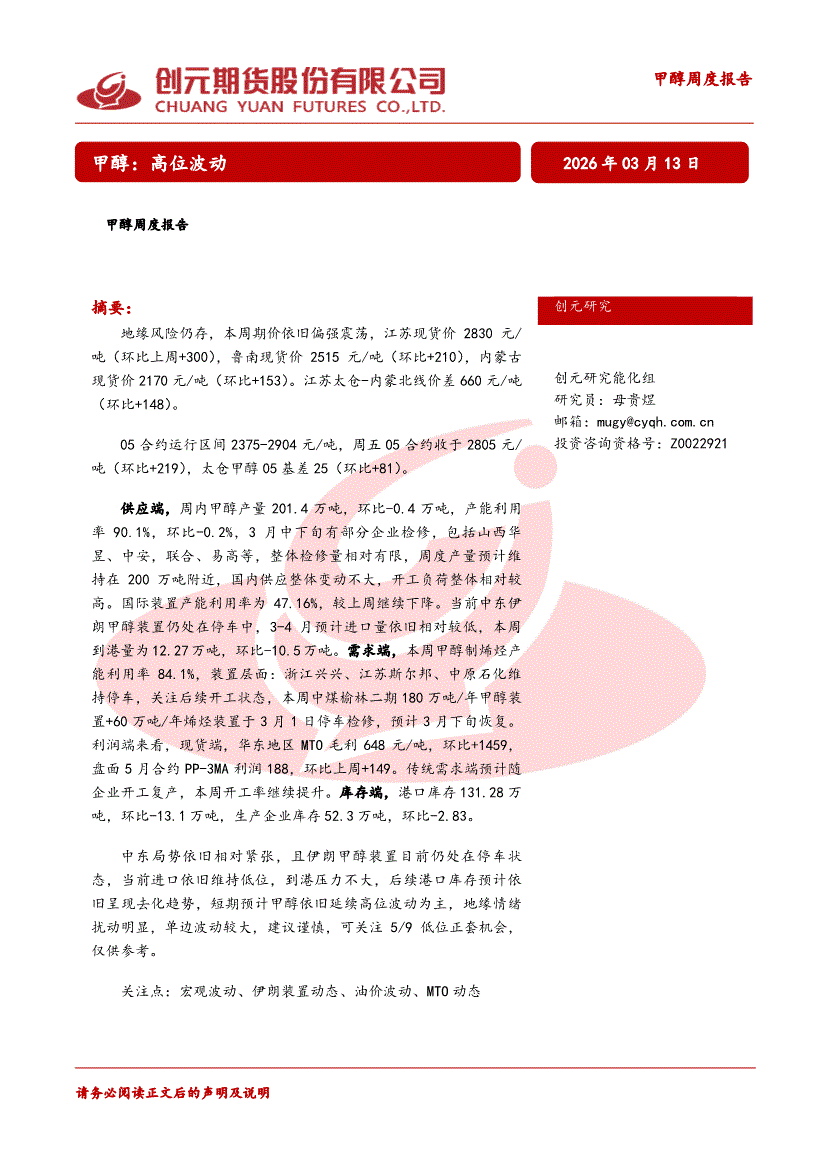 创元期货-甲醇周度报告:偏强运行,关注地缘-260322