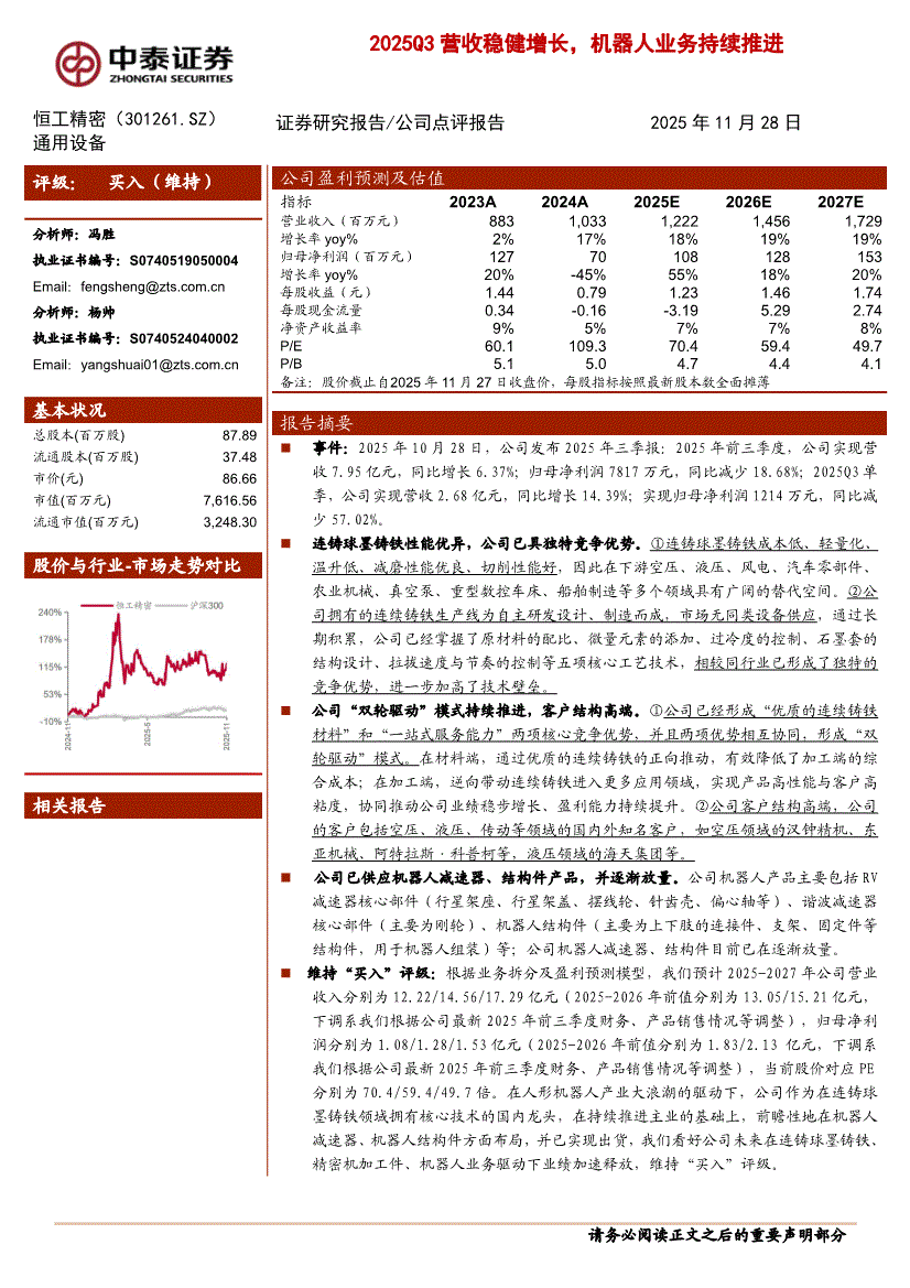 恒工精密:中泰证券-恒工精密-301261-2025Q3营收稳健增长,机器人业务持续推进-251128