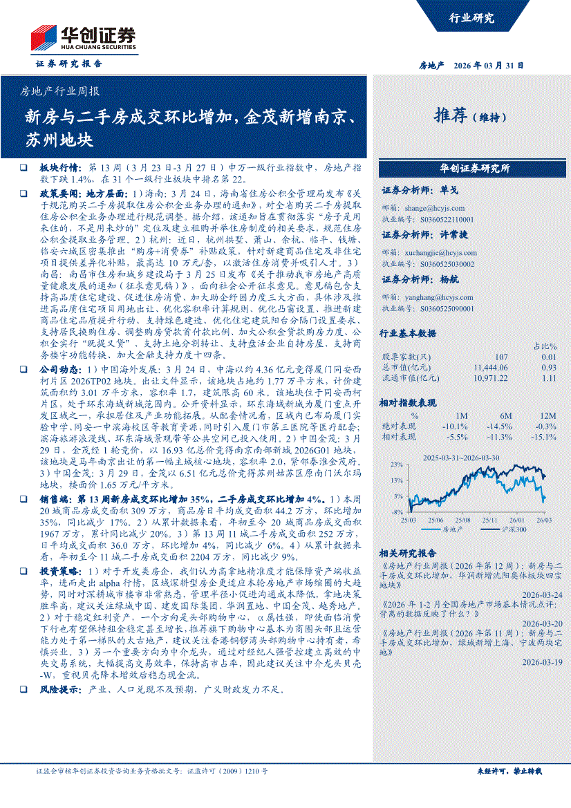 房地产行业:华创证券-房地产行业周报(2026年第13周):新房与二手房成交环比增加,金茂新增南京、苏州地块-260331