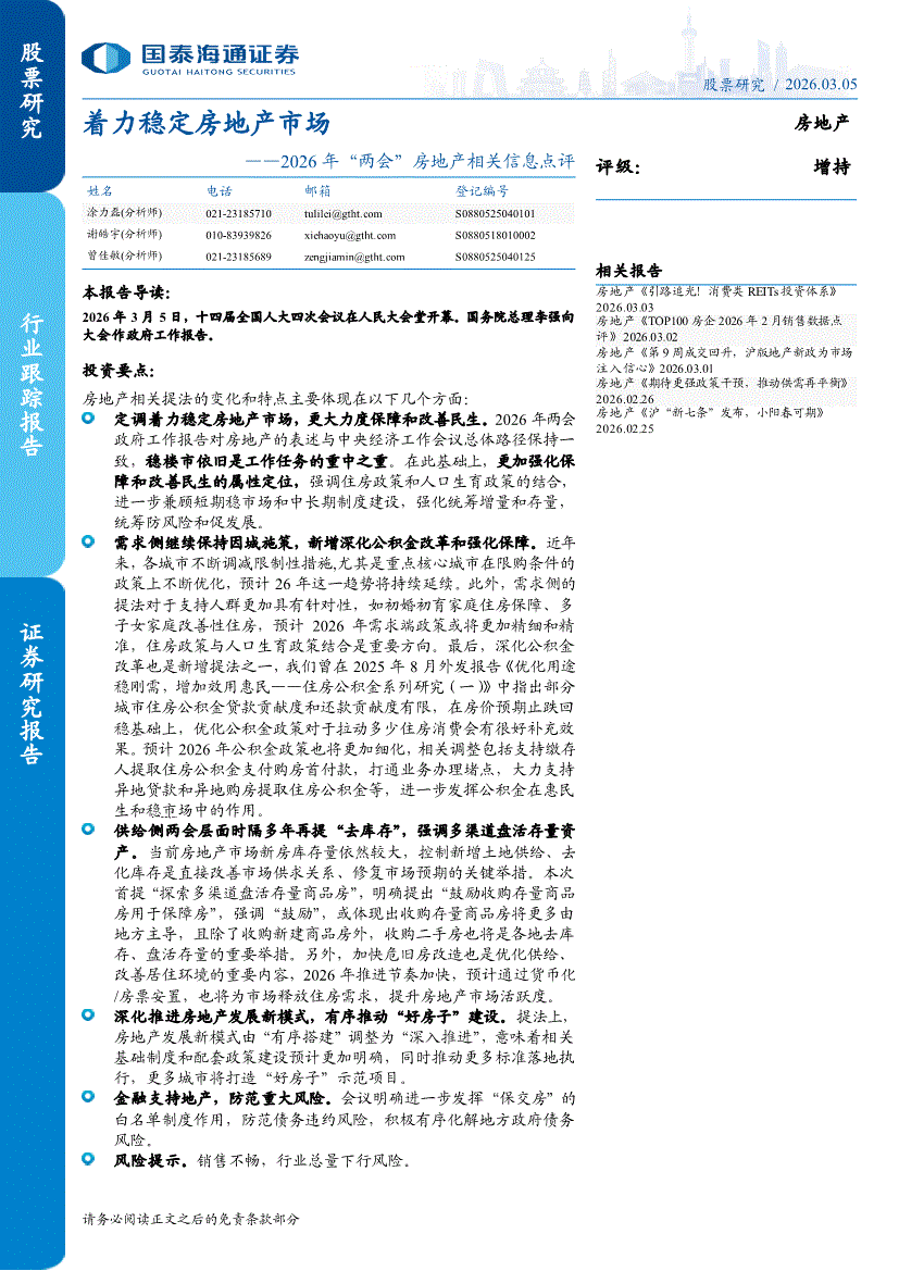 房地产行业:国泰海通证券-房地产行业2026年“两会”房地产相关信息点评:着力稳定房地产市场-260305