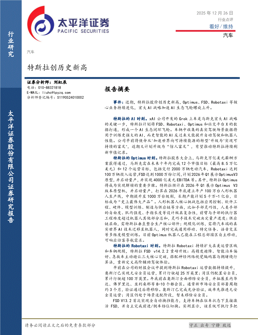 汽车行业:太平洋证券-汽车行业:特斯拉创历史新高-251226