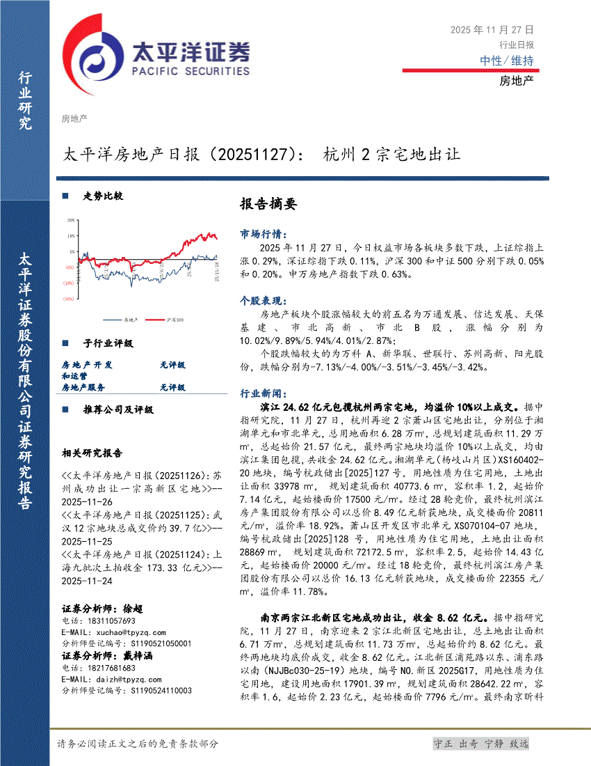 房地产行业:太平洋证券-房地产行业日报:杭州2宗宅地出让-251127