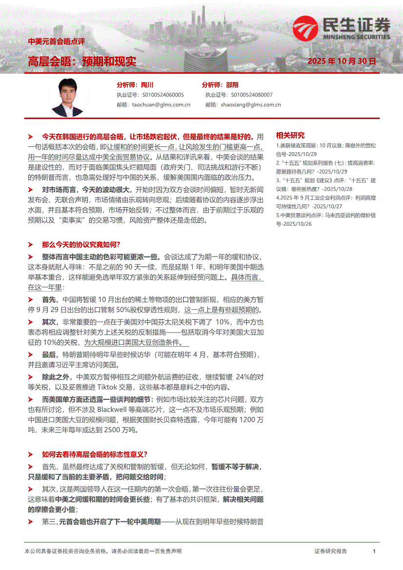 民生证券-中美元首会晤点评:高层会晤,预期和现实-251030