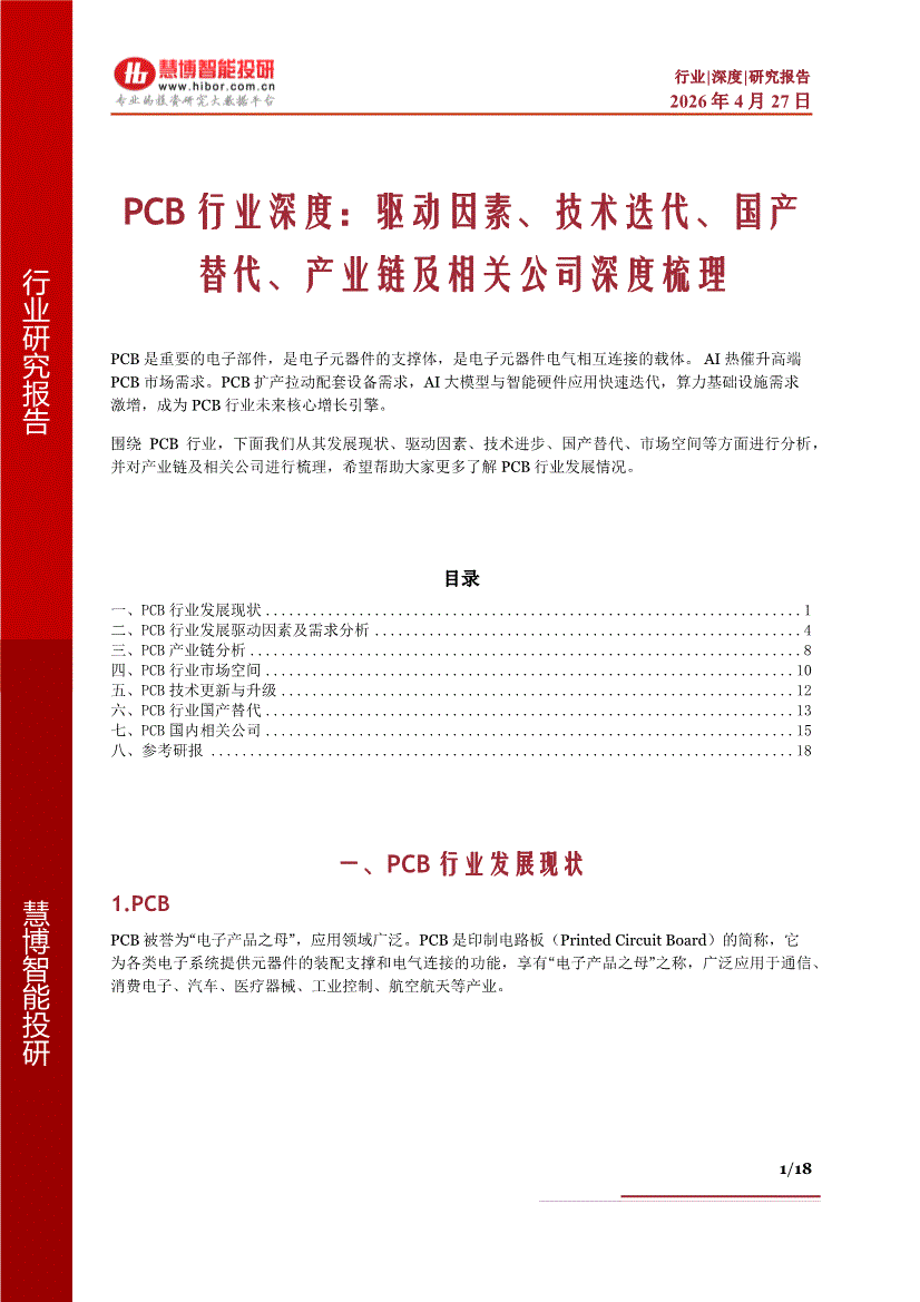 PCB行业:慧博智能投研-PCB行业深度:驱动因素、技术迭代、国产替代、产业链及相关公司深度梳理-260427